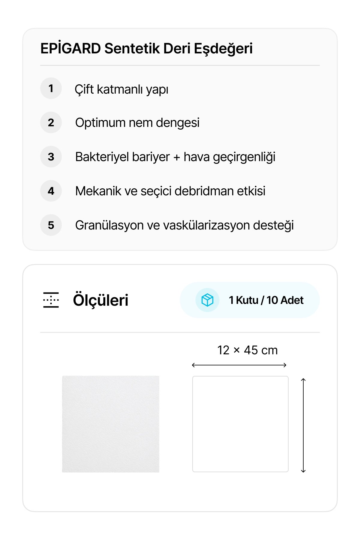 EpiGARD yarayı temizlerken aynı zamanda daha sonraki deri nakli için yaranın optimum nem koşullarını korur. EpiGARD, tekstil olmayan, çift katlı sentetik bir malzemeden yapılmıştır ve herhangi bir katkı maddesi içermez. Üst yüzeyi ince, mikro gözenekli bir filmden oluşur. Hava ve buhar geçirgendir. Böylece, yarayı dış bakteriyel yüklerden veya sıvılardan korurken, sekresyonların birikmesini önler. Alt kısım, esnek, yumuşak poliüretandan yapılmış açık bir matris oluşturur. Yara eksüdası, ince gözenekli bu yapıya yapışır ve pansuman değiştirildiğinde nekrotik doku ile birlikte çıkarılır. Fibroblastlar ve damarlar, mekanik yara temizleme aşamasında yara bölgesinde ve açık matris poliüretan köpükte büyümeye baslar. Genel olarak, Epigard’ın günlük olarak değiştirilmesi neticesinde, yara kısa sürede sonraki transplantasyon için şartlandırılır.