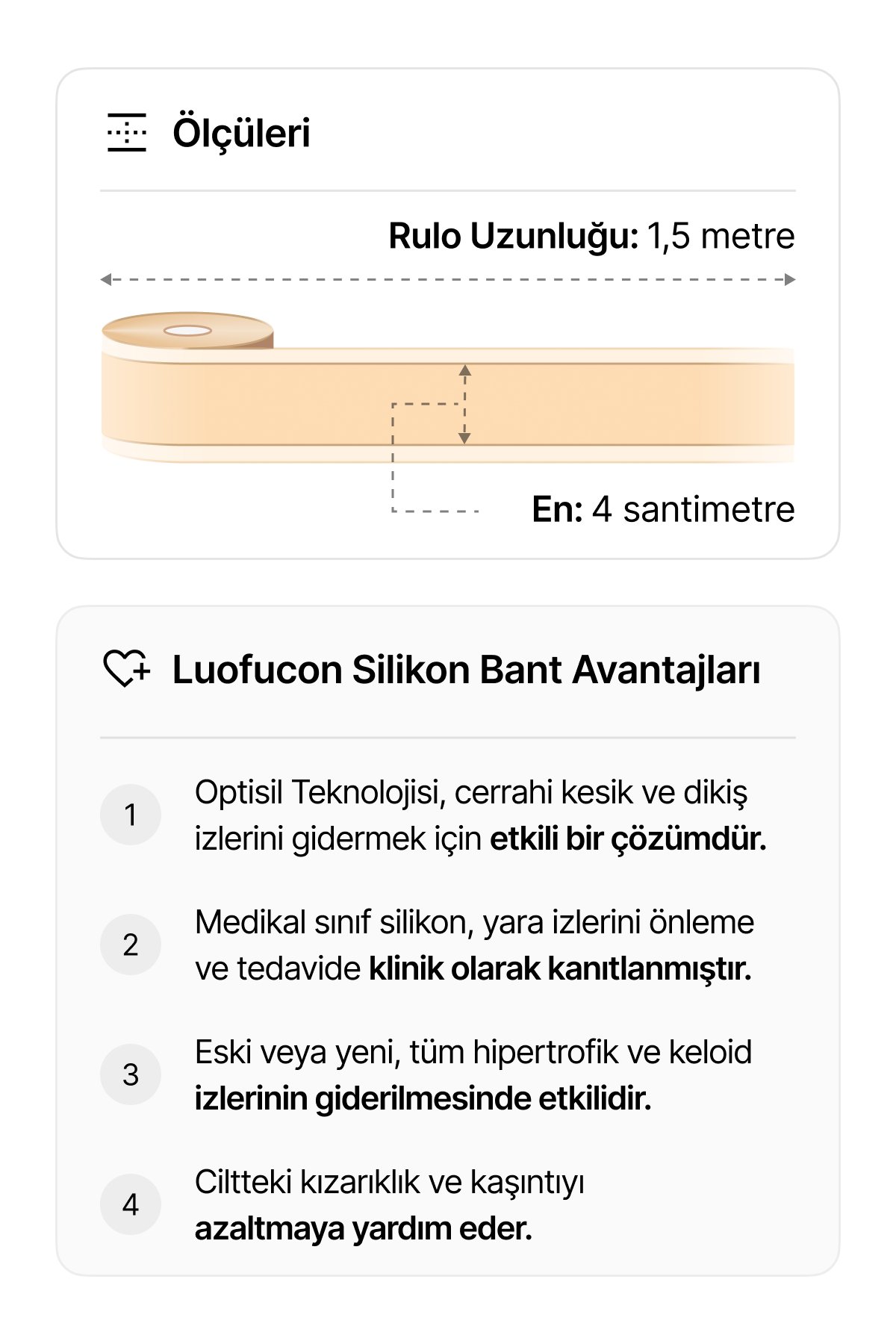 • Luofucon Silikon Bant doğrudan cilde uygulandığında ameliyat sonrası oluşan izleri gidermeye yardımcı olur.
