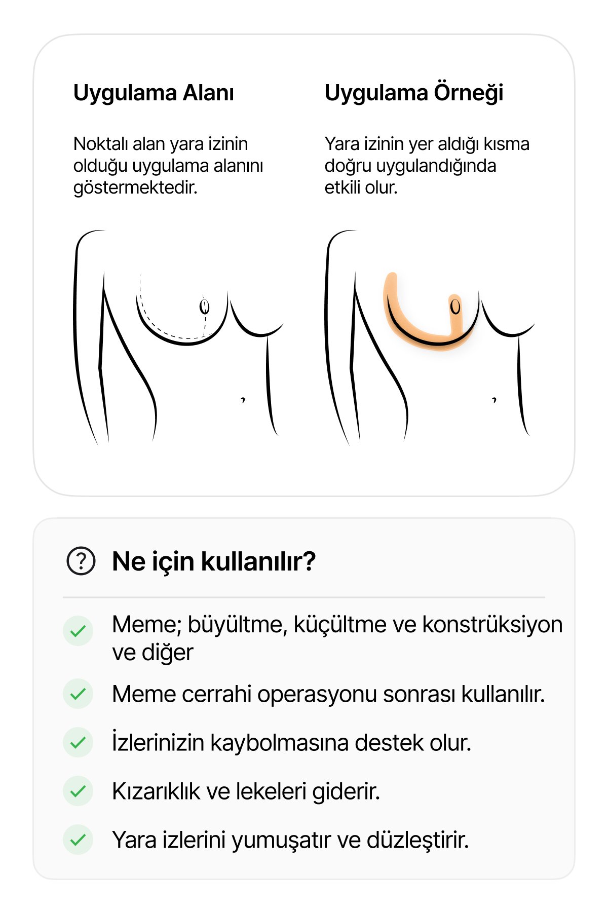 Sadece harici kullanım içindir. Hem mevcut hem de yeni hipertrofik veya keloid skarların yönetiminde geçici kullanım. Hipertrofik veya keloid yara izini önlemek için kapanmış yaralarda profilaktik tedavi olarak geçici kullanım. Açık yaralarda kullanmayınız.