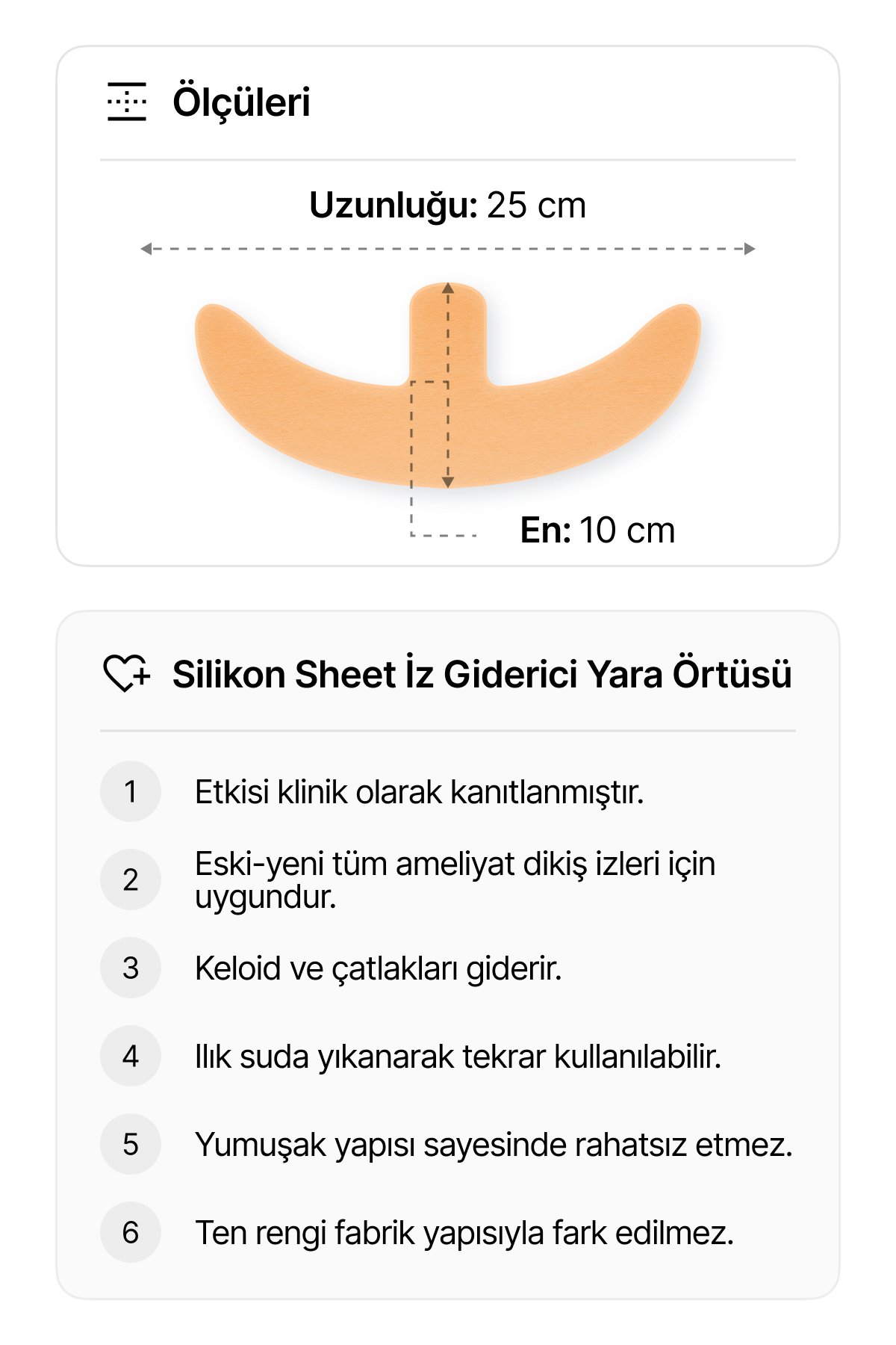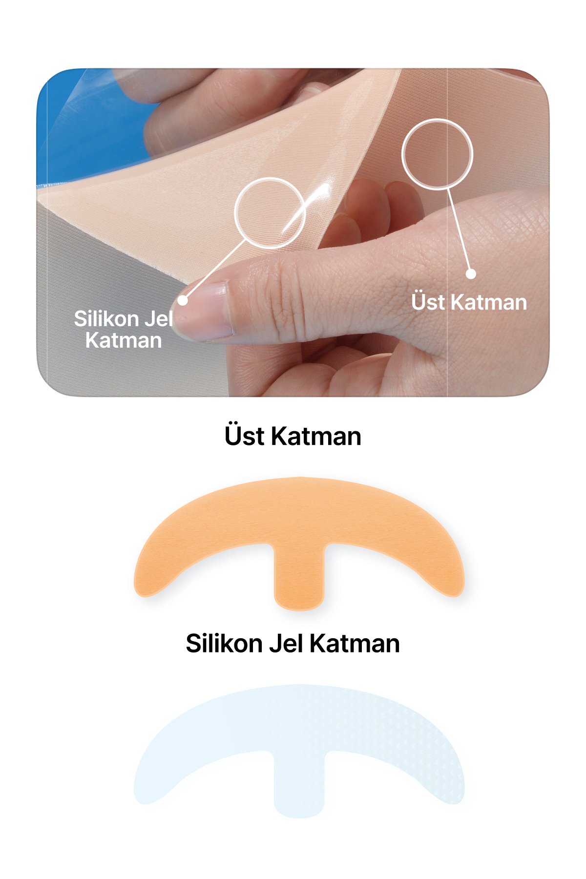 • Bu yumuşak, ince, tekrar kullanılabilen ve kendinden yapışkanlı silikon jel tabaka, esas olarak silikondan yapılmıştır. Hem mevcut hem de yeni oluşan hipertrofik veya keloid skarların yönetiminde kullanıldığı gibi iyileşme sürecindeki yaralarda hipertrofik veya keloid skar oluşumunu önlemek için profilaktik bir tedavi olarak da etkilidir.