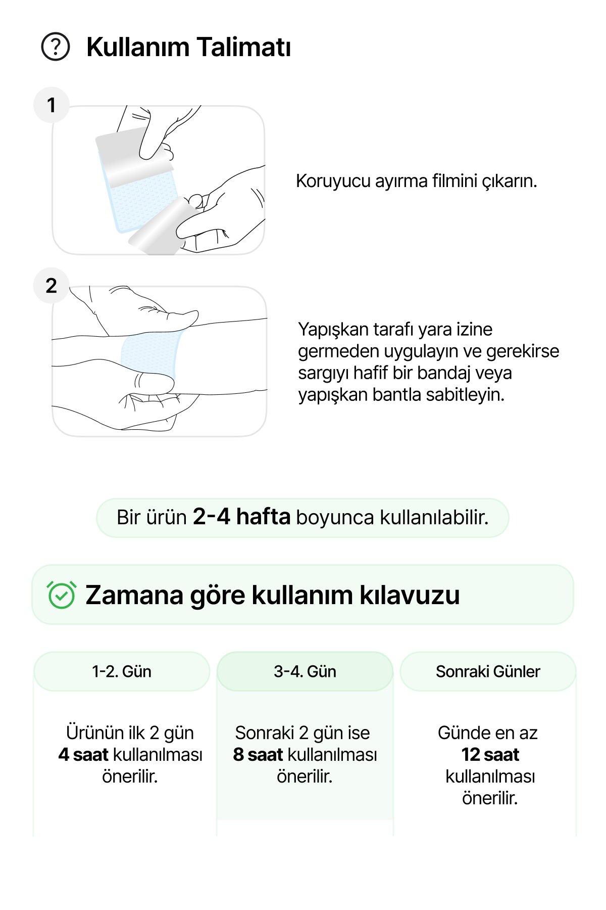 • Pansumanı en az 12 saat boyunca yerinde bırakın, gerekirse günlük olarak değiştirin.