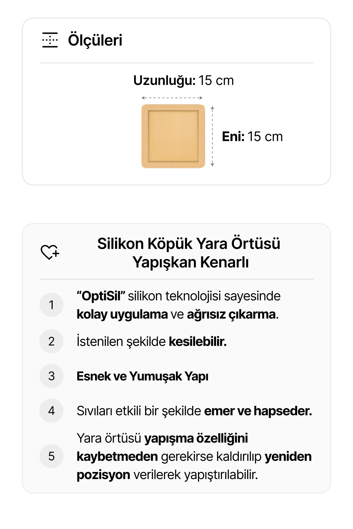 • Yeni nesil OptiSil® silikon teknolojisi, nazik yapışma sağlar; ağrıya ve travmaya neden olmadan uygulanabilir ve çıkarılabilir.