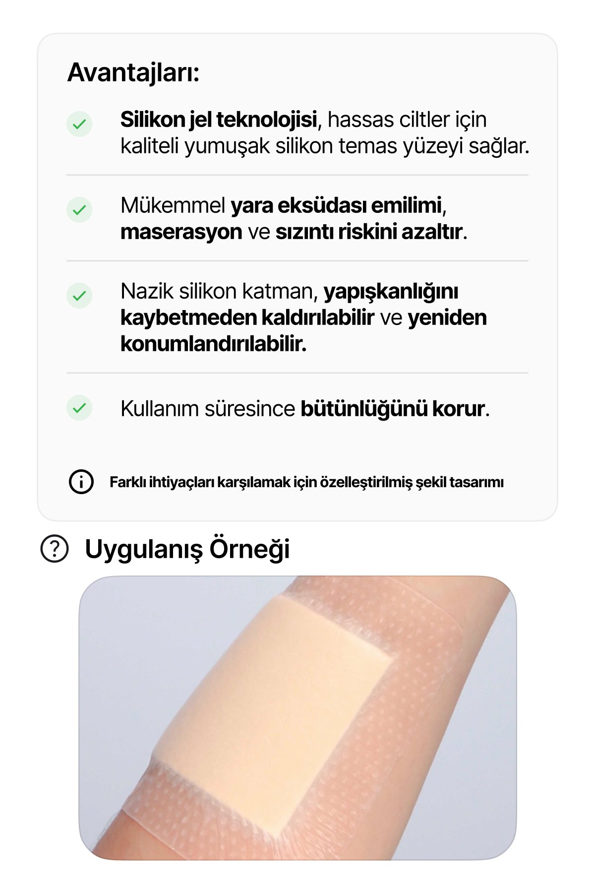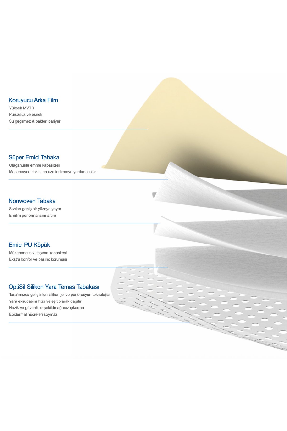 Tarafımızca geliştirilen silikon jel ve perforasyon teknolojisi sadece yara yüzeyine nazik bir bakım sağlamakla kalmaz, aynı zamanda eksüdanın pansumanın içine inanılmaz derecede hızlı bir şekilde girmesini sağlar. Çıkarıldıktan sonra etkinlikte hiçbir azalma oluşmaz.