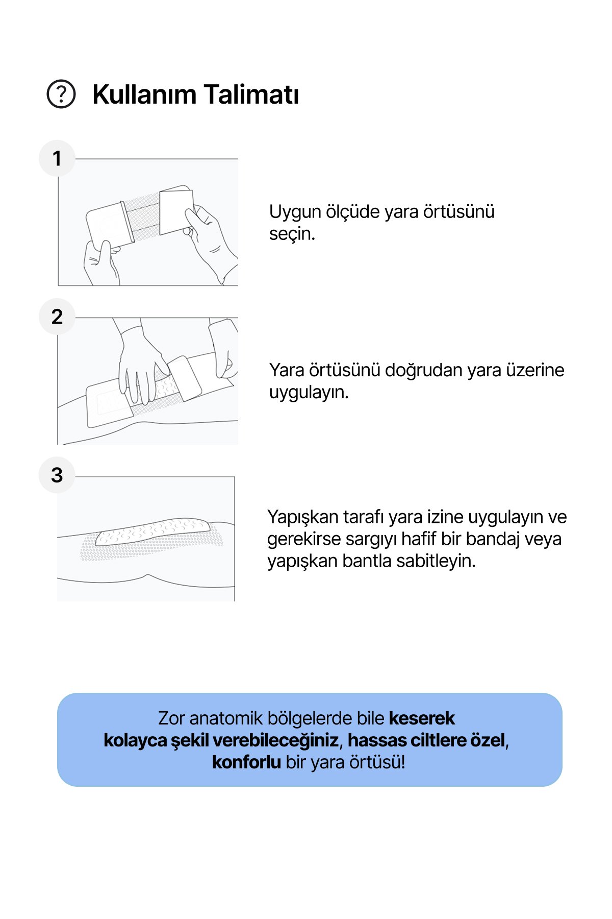 • Zor anatomik bölgelerde bile keserek kolayca şekil verebileceğiniz, hassas ciltlere özel, konforlu bir yara örtüsü!
