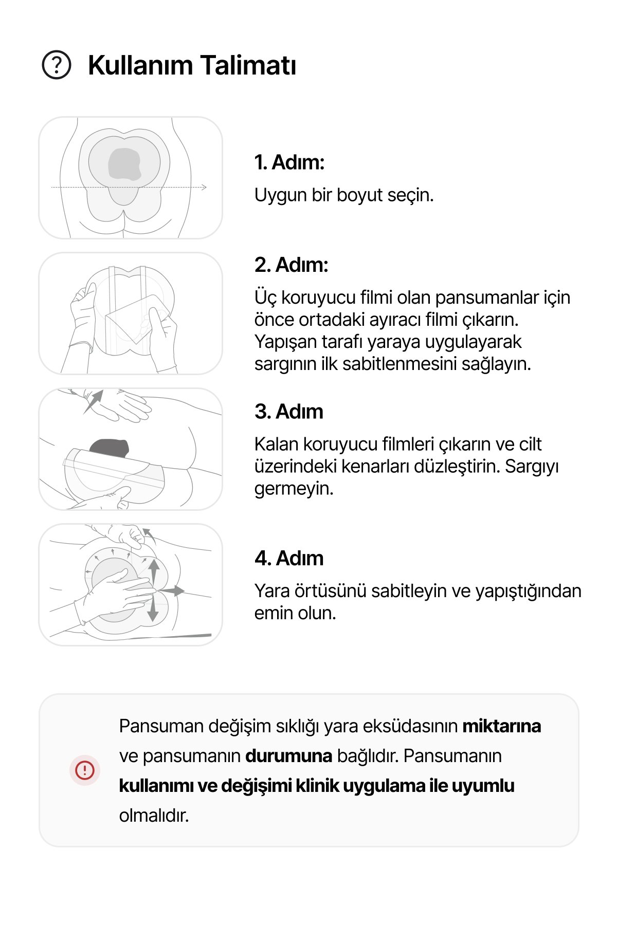 • Farklı vücut bölgelerine uyum sağlayabilen yapısıyla; her pansumanda rahat uygulama, güvenli koruma ve hasta konforunu bir araya getirir.