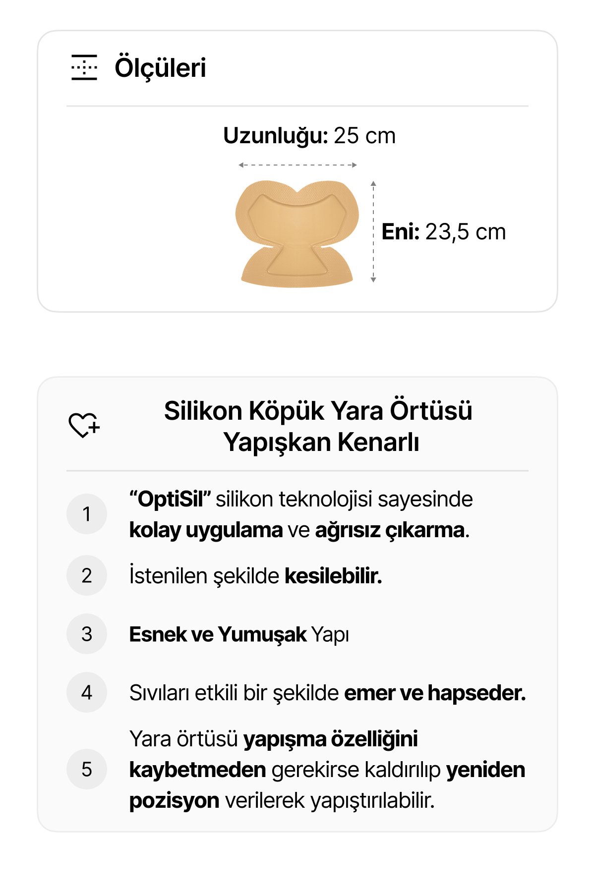 • Yeni nesil OptiSil® silikon teknolojisi, nazik yapışma sağlar; ağrıya ve travmaya neden olmadan uygulanabilir ve çıkarılabilir.