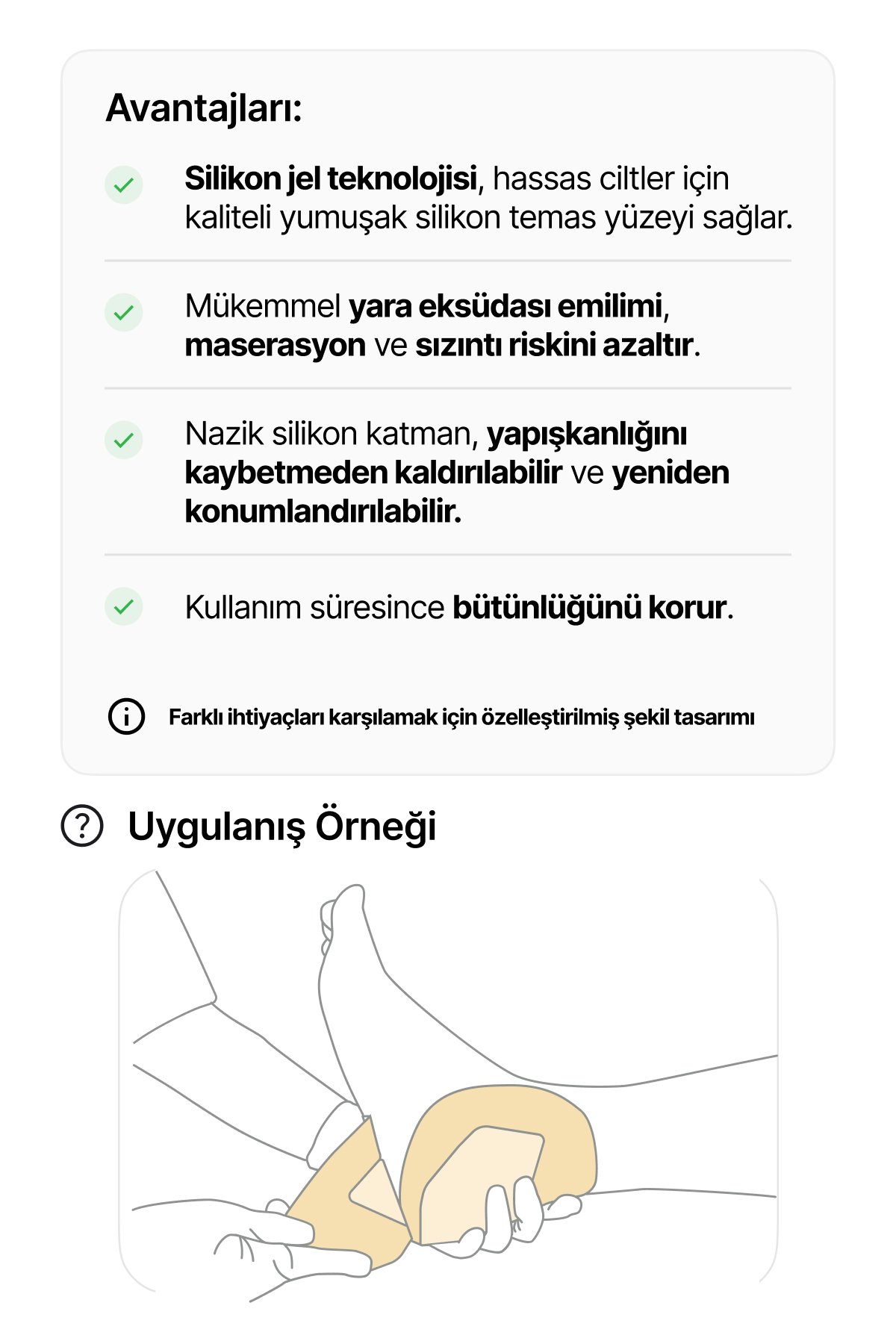 • Bası yaraları, diyabetik ayak ülserleri, venöz ülserler, cilt yırtıkları ve travmatik yaralanmalarda etkili bir çözümdür.