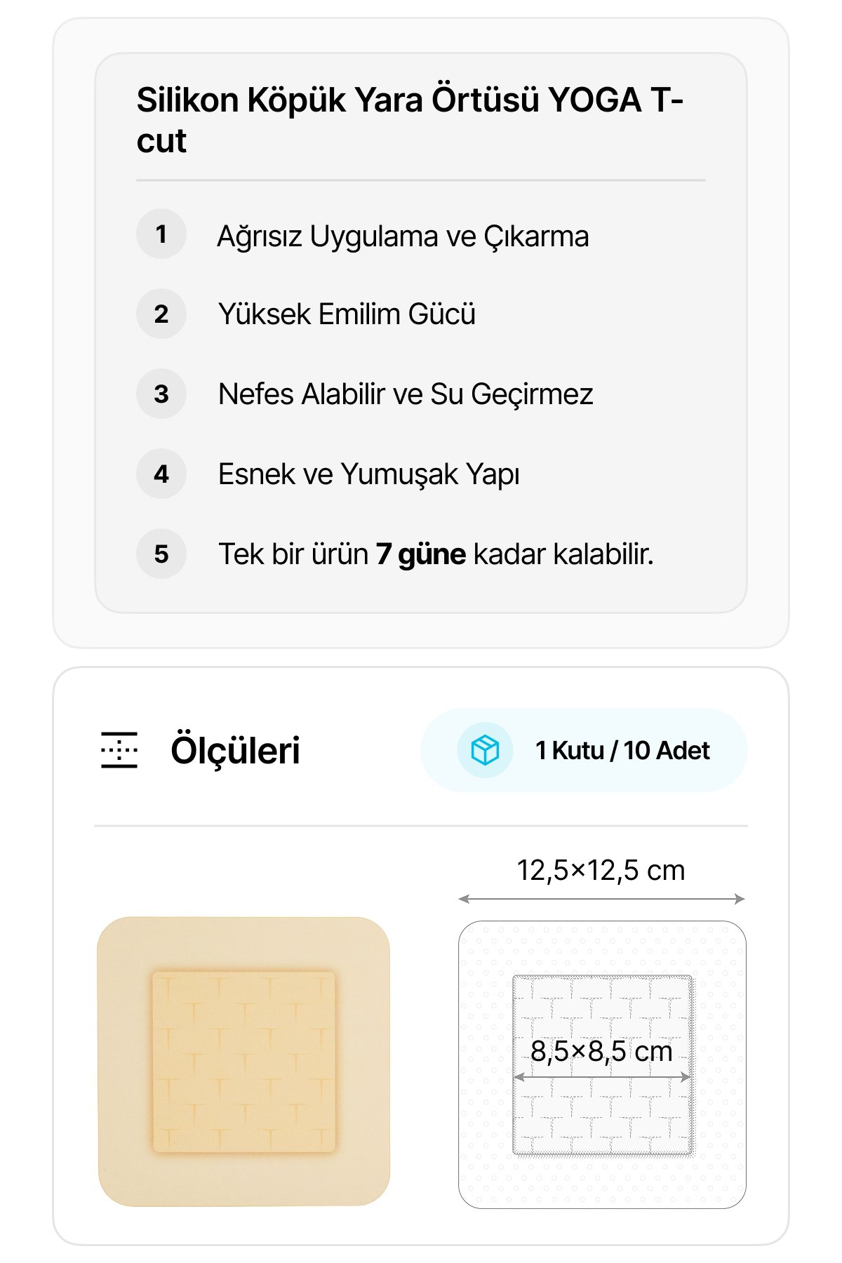 •  Esnek ve Yumuşak Yapı:Özellikle hareketli bölgelerde (dirsek, topuk, sakrum) rahat kullanım sağlar, günlük yaşamı kısıtlamaz.