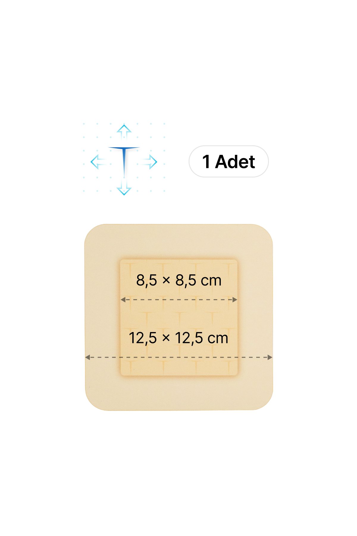 Yüksek uyarlanabilirliğe sahip süper emici peddeki yarı delikli T şeklindeki özel tasarım, kullanım sırasında pansumanın bütünlüğünü sağlamanın yanı sıra dinamik esneklik yaratır.