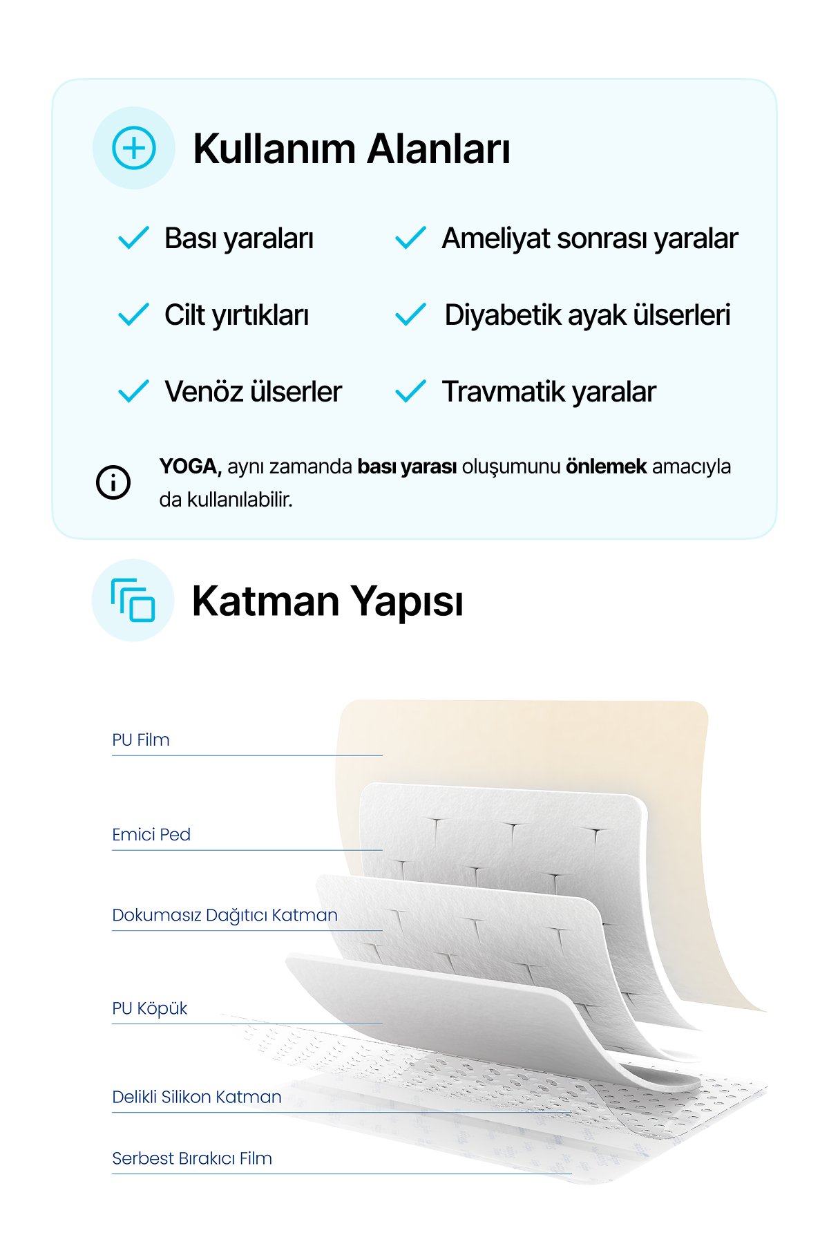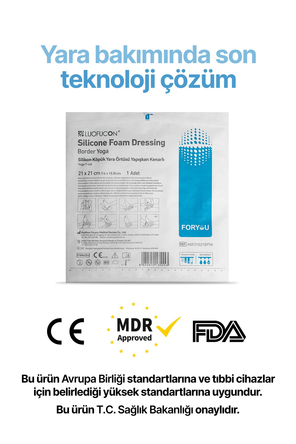 LUOFUCON® Silikon Köpük Yapışkanlı Yara Örtüsü YOGA, silikon bir yara temas tabakası, süper emici bir ped, dokunmamış bir dağıtıcı tabaka, bir poliüretan köpük ve buhar geçirgen ve su geçirmez bir poliüretan filmden oluşur. Benzersiz yarı delikli T şekli desenleri ile çok katmanlı yapı, optimum nemli yara ortamı sağlamak için dinamik sıvı yönetimini kolaylaştırır, yaranın daha hızlı kapanmasını destekler ve maserasyon riskini azaltmaya yardımcı olabilir. Nazik silikon katman, yapışkanlığını kaybetmeden kaldırılabilir ve yeniden konumlandırılabilir. Ayrıca, bu tabaka hasta ağrısını ve yaralara ve çevresindeki cilde travmayı en aza indirebilir. Emici ped tabakası üstün emilim sağlar ve eksüdaları hapseder.