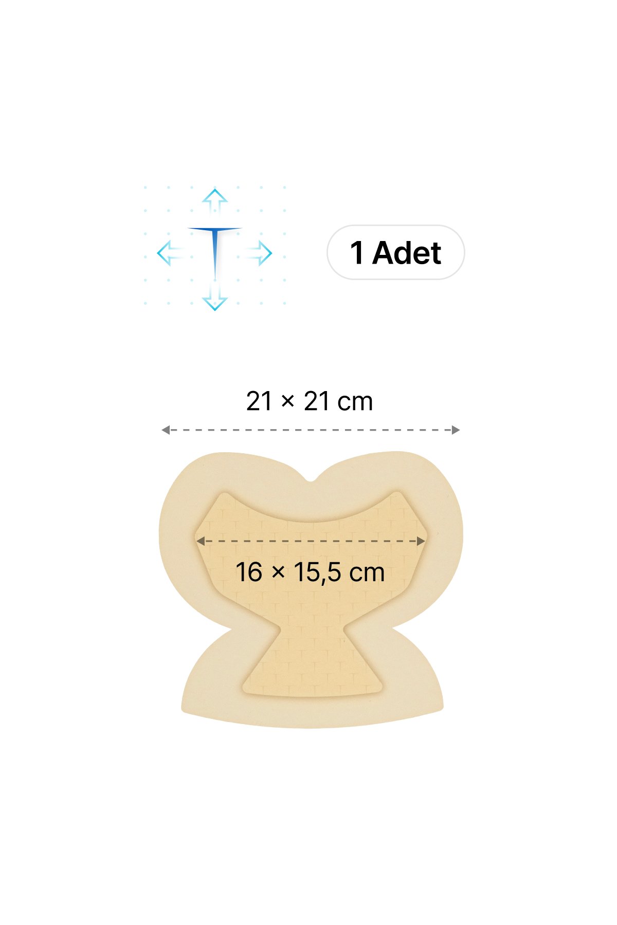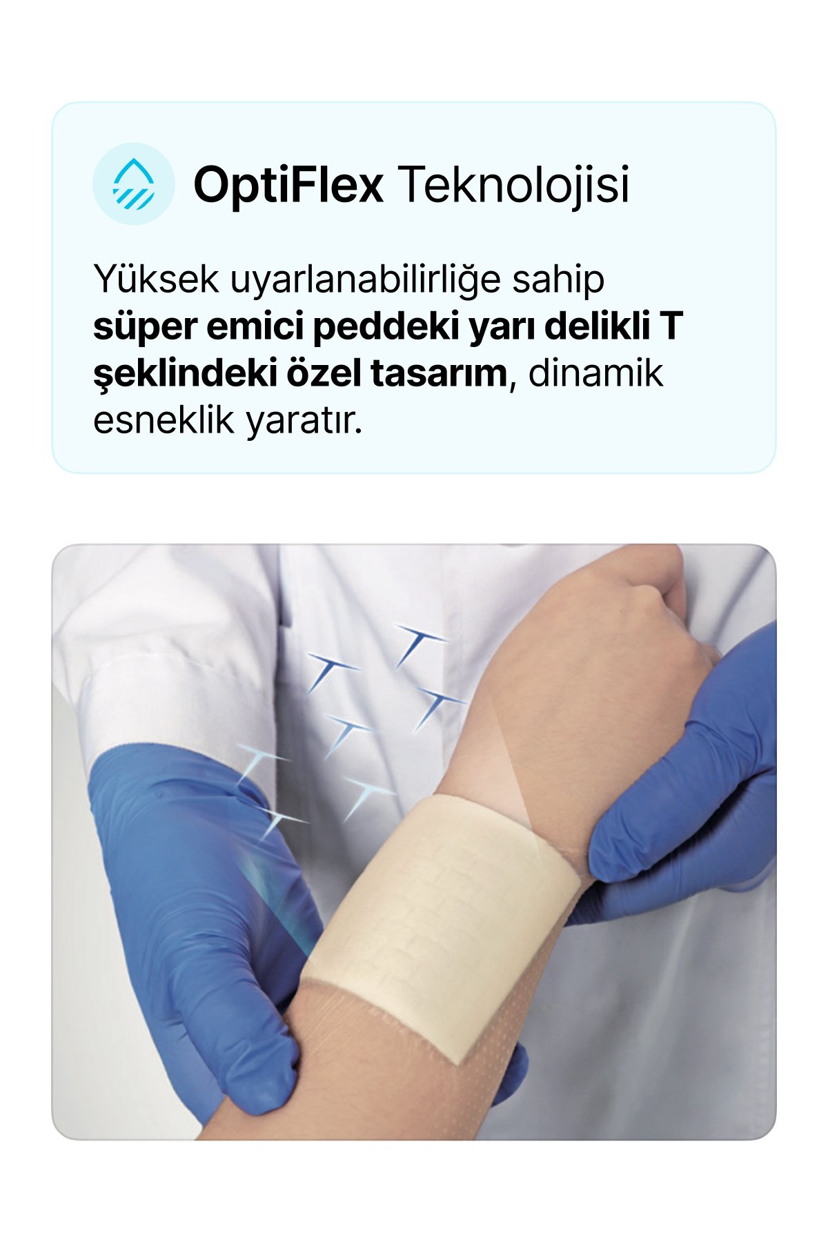 Yüksek uyarlanabilirliğe sahip süper emici peddeki yarı delikli T şeklindeki özel tasarım, kullanım sırasında pansumanın bütünlüğünü sağlamanın yanı sıra dinamik esneklik yaratır.