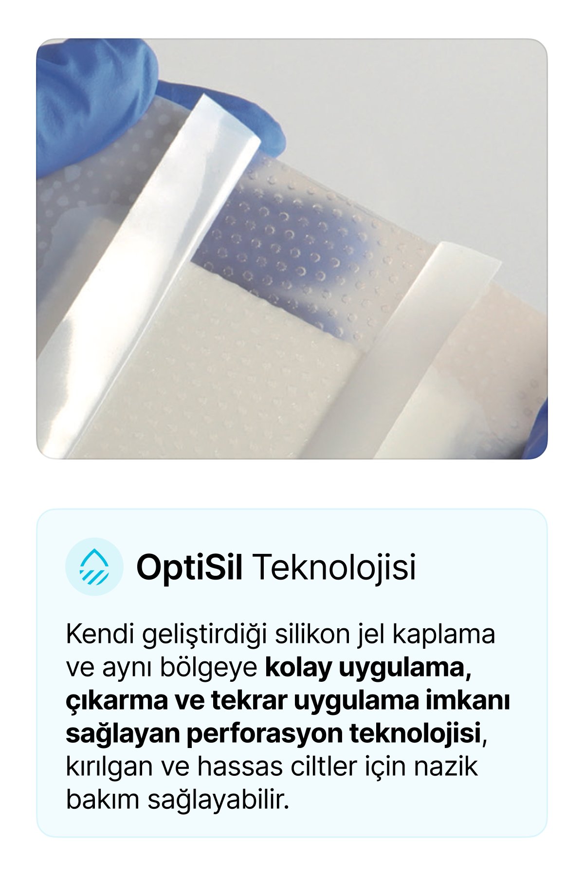 Kendi geliştirdiği silikon jel kaplama ve aynı bölgeye kolay uygulama, çıkarma ve tekrar uygulama imkanı sağlayan perforasyon teknolojisi, kırılgan ve hassas ciltler için nazik bakım sağlayabilir.