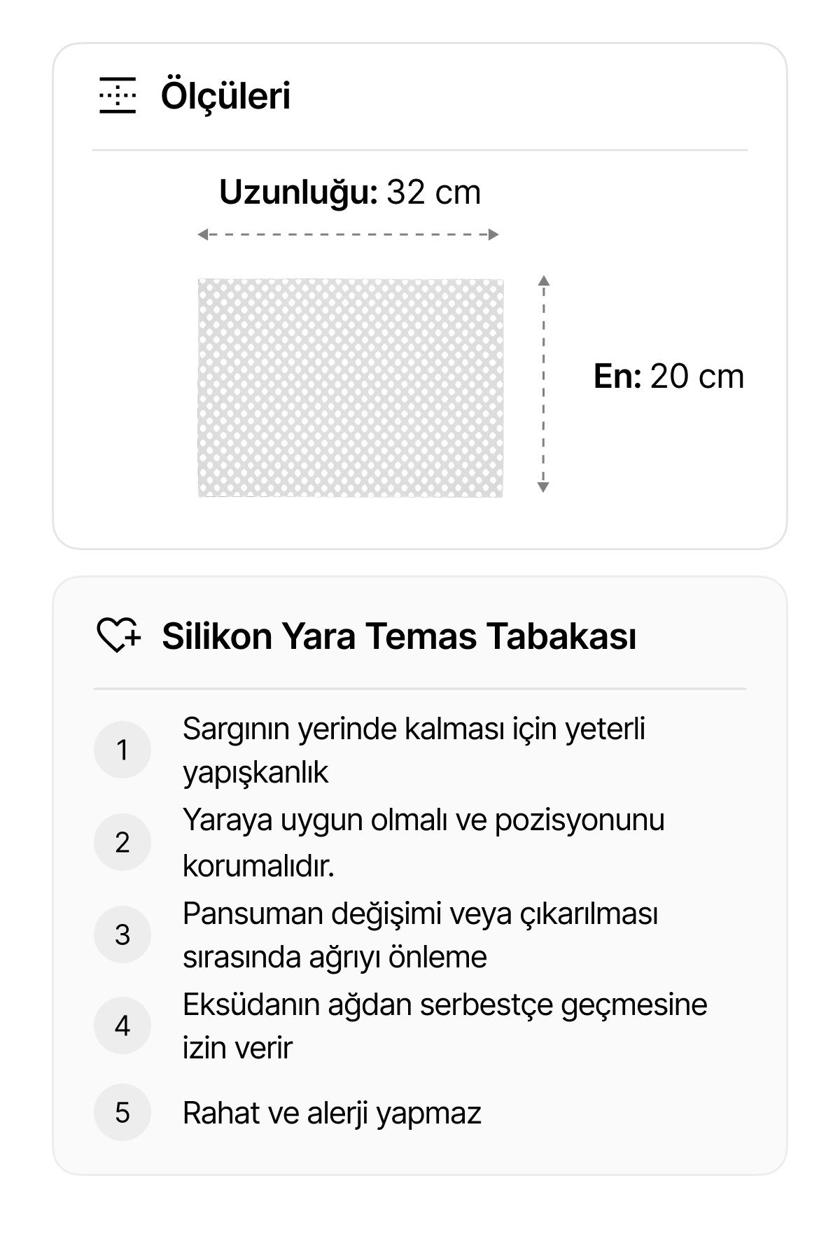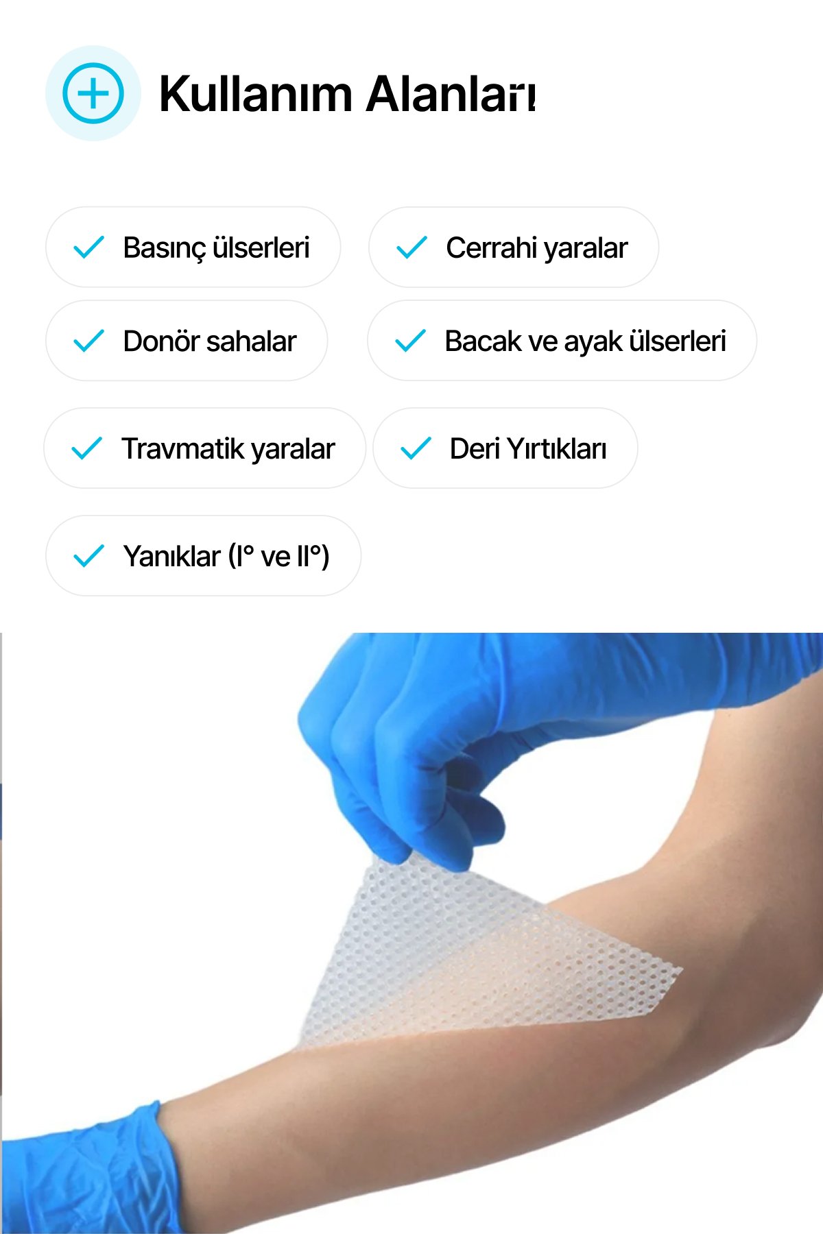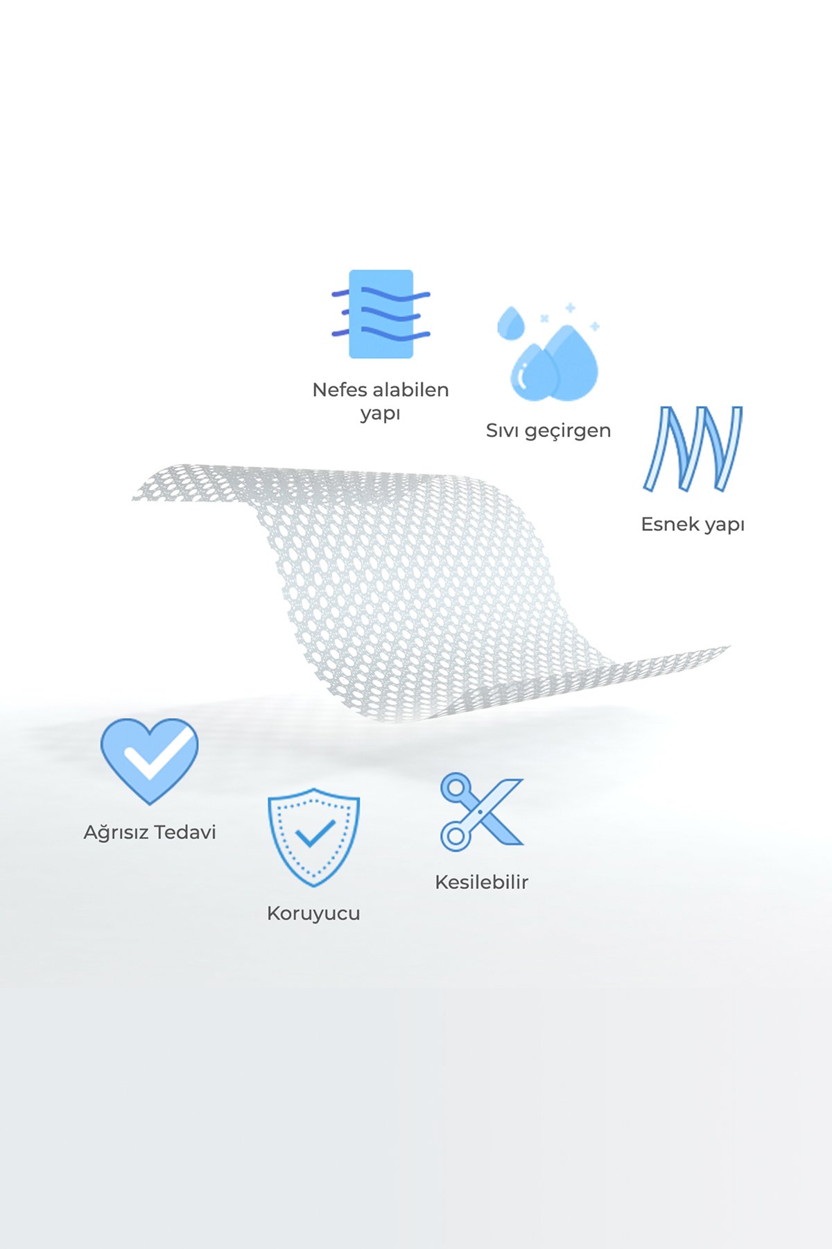 • Ürünün üstüne emici bir ped uygulanabilir, sıvı geçirgenliğine sahip porlu ağ formundadır.